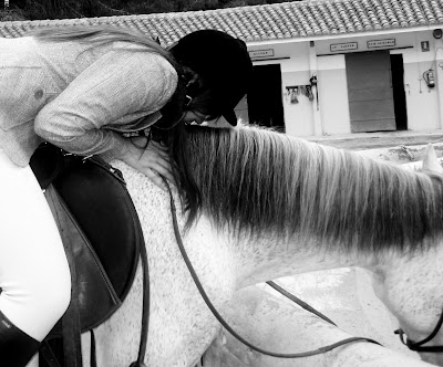 ¿Un día normal? No,no. Un día que no quieres que empiece pero que deseas que acabe. Un día de esos en los que te apeteceria desaparecer y evaporarte con el aire. En esos dias decido alejarme de todo el mundo. B, el mejor caballo del mundo, y yo nos vamos de escapada y nos alejamos de todo y de todos. Solos, B y yo. Así he pasado muchisimos dias, muchisimas horas junto a el, pero nunca suficientes. Todo el mundo lo susurra y yo lo grito. Estoy enamorada de ese caballo blanco,joven y de suave pelaje. Es increiblemente gloton, nunca te dirá que no a un azucarillo ni a una zanahoria , por que es lo que más le gusta. Por las mañanas, a primera hora me desespera y siempre termino riñendole por que es mas perro que un oso hormiguero y me cuesta horrores ponerle a galopar, pero luego disfrutamos los dos como niños. He visto la muerte encima suya y he tocado el cielo de satisfaccion tambien sobre el. Sabe perfectamente quien soy y me reconoce por mi voz.